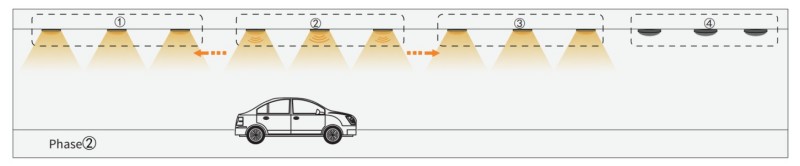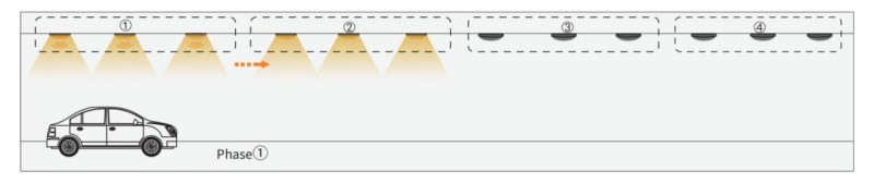 2.Nalika mobil ngliwati Group2, sensor grup2 bakal ngaktifake klompok sabanjure lan grup3 sabanjure. Lampu liyane isih mati.