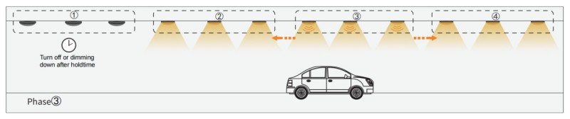 1.Nalika sensor grup1 ndeteksi gerakan, mula bakal ngaktifake grup2 sabanjure. Dadi Group1 lan Group2 bakal urip nanging lampu liyane tetep ora mati. Minangka rong sensor diprogram ing 1 klompok, lampu papat loro kelompok kasebut bakal bebarengan.