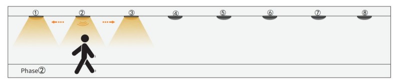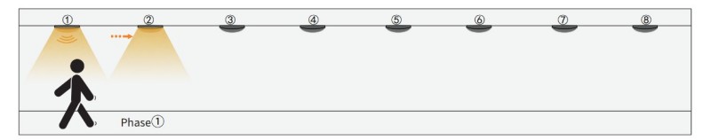 1. Yen sensor klompok ndeteksi gerakan, bakal ngaktifake grup2 sabanjure, mula grup 1 lan Group2 bakal diuripake. Nanging, sisa lampu isih durung mati.