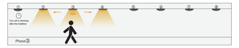 3.Nalika obyek ing Group3, sensor grup3 bakal ngaktifake klompok2 lan group4. Kelompok liyane tetep mati. Group1 bakal mateni utawa mudhun nalika sensor gerakan ora nampa utawa ndeteksi sinyal RF sawise suwe.