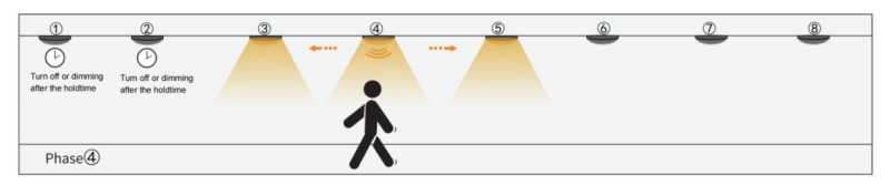 4. Yen wong-wong liwat Group4, grup 4 Sensor bakal aktif para Gruop3 lan group5. Sisa lampu isih mati. Group1 lan grup 2 bakal mateni utawa mudhun amarga sensor gerakan ora nampa utawa ndeteksi sinyal RF sawise suwe.