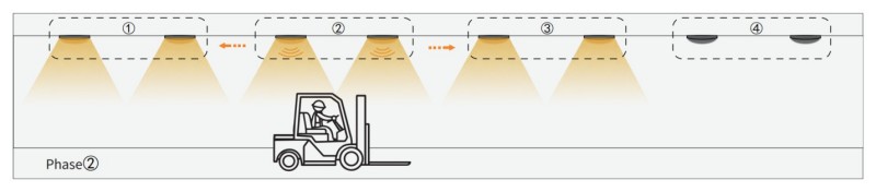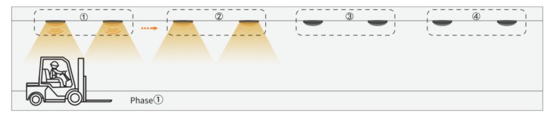 2.Nalika obyek kasebut ngliwati grup2, sensor grup2 bakal ngaktifake klompok sabanjure lan grup3 sabanjure. Lampu liyane isih mati.