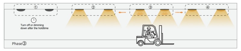3.Nalika obyek kasebut ngliwati Group3, sensor grup3 bakal ngaktifake group2 lan group4 tetanggan. Lampu klompok liyane isih mati. Group1 bakal mateni utawa mudhun nalika sensor gerakan ora nampa utawa ndeteksi sinyal RF sawise suwe.