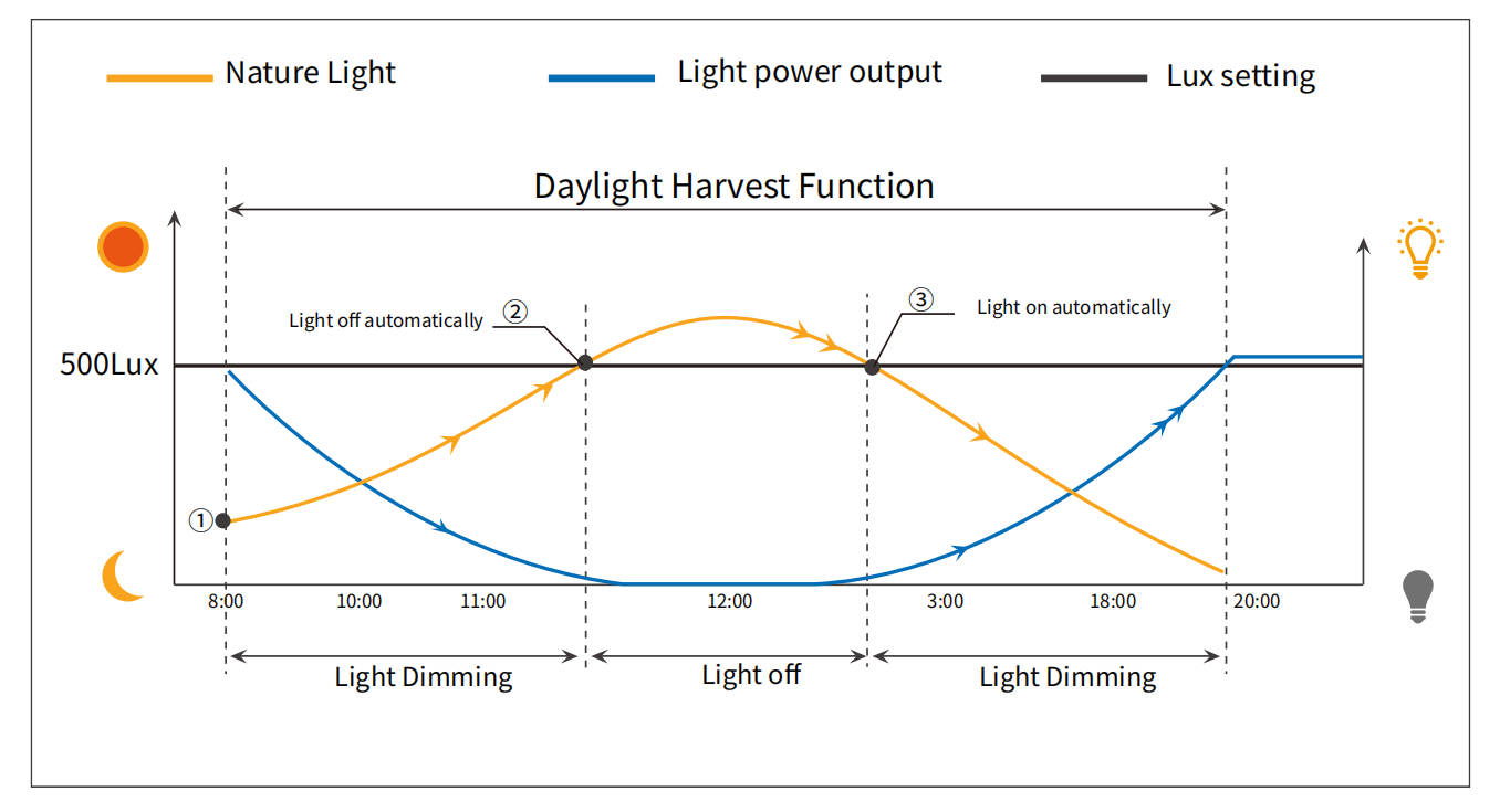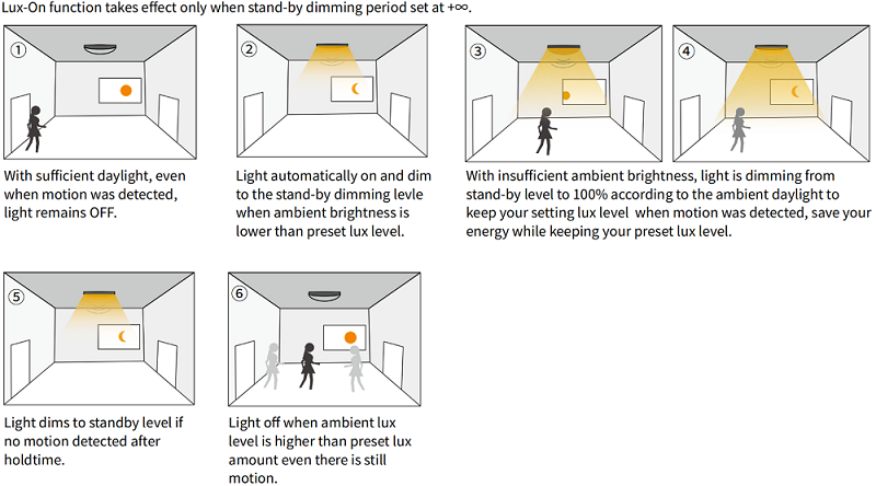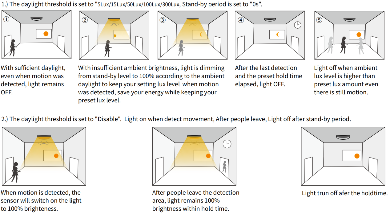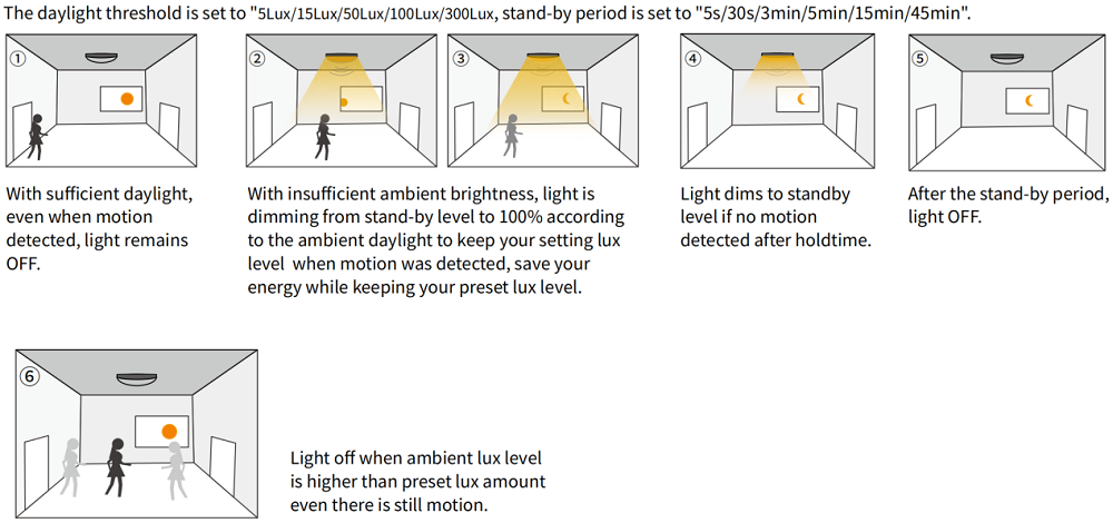 Thanks kanggo teknologi Dual-PD, sensor MC004-S02R bisa nyritakake bedane cahya sing alami lan lampu sing dipimpin gawean. Sensor bakal ngaktifake lampu cahya sampeyan nalika lampu ambient luwih murah tinimbang nilai setelan, sanajan ora ana gerakan sing dideteksi. Nalika lampu ambient nganti regane setelan, sensor bakal mateni lakune cahya sanajan isih ana gerakan.