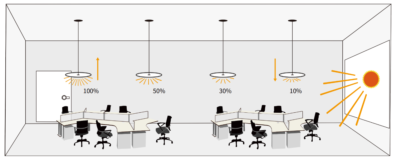 Yen sensor ndeteksi lampu alam, bakal nyirami cahya, lampu cahya yaiku output dimmut kaya ing ngisor iki: